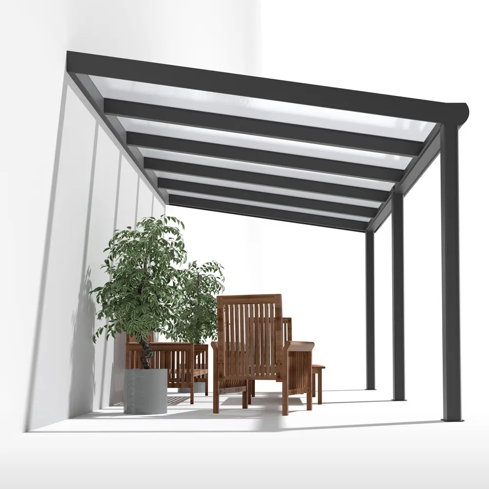 Unser Terrassendach aus Aluminium in Anthrazit mit 16mm klaren Stegplatten bietet Ihnen optimalen Schutz vor Regen und Sonne – und das mit modernem Design und höchster Langlebigkeit.